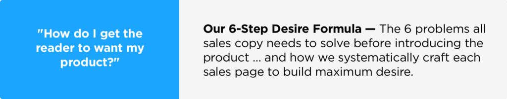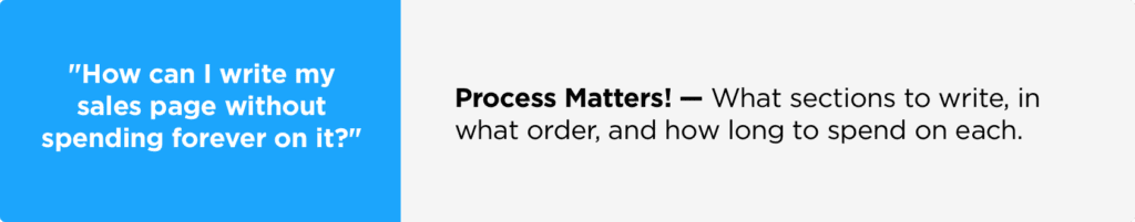 Now when I’m writing a sales page, I wake up, make my coffee, and sit down to write. I already know about the positioning I’m going to take. I already have my examples ready to copy and paste from another document. And I don’t have to worry about where to start, which sections to write, or whether or not the copy is good.