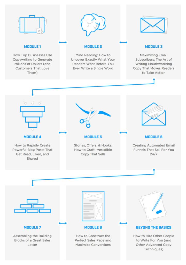 All-new copy teardowns: Watch me tear down and rewrite other students’ copy on the spot. You’ll even get to listen in on a call with me and one of my senior writers as we create sales funnels and sales pages for a $25,000 product. Learn how to think like a copywriter and see how you can create compelling sales copy out of thin air.