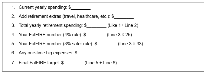 Keep in mind that inflation will also affect your calculations. What costs $125,000 today might cost $180,000 in 20 years. So, adjust your targets periodically as you approach your Fat FIRE date. For more detailed calculations, check out my Retirement Calculator Tool.