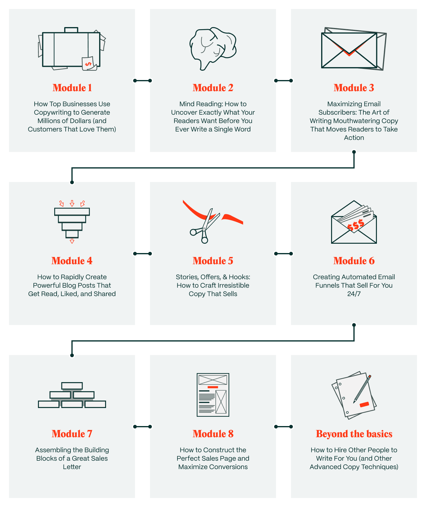 You’ll find hours and hours of organized videos, case studies, tools, and material that gives you instant access to the answers you’ll need to take care of any copy challenge you’ll face.