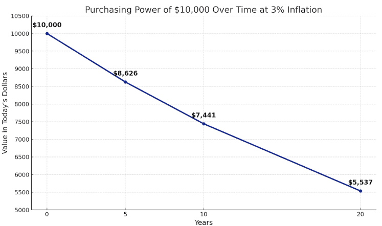 At 3% annual inflation, $10,000 today will only have the purchasing power of about $8,626 after 5 years. You've lost nearly $1,400 in buying power without spending a penny.