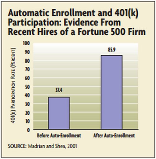 Do you contribute to your 401(k)? In one study, 37.4% of employees contributed when they had to complete forms (i.e., actively take action) ….but that number skyrocketed to 85.9% when they were automatically enrolled in the 401(k) plan, not requiring them to take any action. (Of course, they could always opt out.)