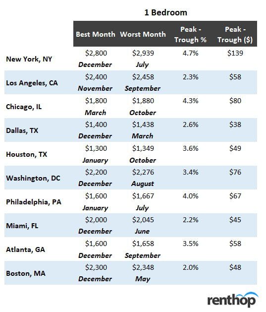 A recent study from RentHop, a popular apartment listing site, discovered that you can save hundreds of dollars a year based on when you negotiate. Check out their chart below for more on the best times to negotiate rent: