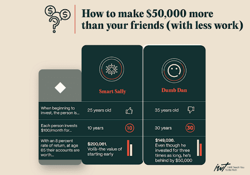 The Smart Sally and Dumb Dan example demonstrates this perfectly. Sally starts investing early and consistently builds her wealth through the power of compound growth. Dan procrastinates and thinks he can make up for lost time by investing more money later. Even though Dan invests for 20 additional years beyond Sally's timeline, he still ends up $50,000 behind her.
