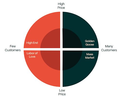 To build a thriving business, try to focus on Golden Goose ideas, where high demand and premium pricing ensure profitability and a steady customer base.
