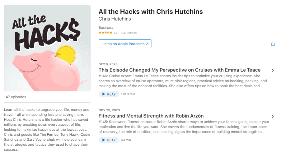 "All the Hacks" is more than just a personal finance podcast; it's a comprehensive guide to various aspects of life where money plays a key role. Whether you're fine-tuning your investment strategy, pondering your next travel adventure, or navigating the complexities of buying a home, Chris has you covered with practical, actionable advice.