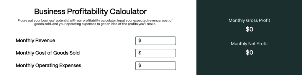 Figure out your business' potential with our profitability calculator. Input your expected revenue, cost of goods sold, and your operating expenses to get an idea of the profits you'll make.