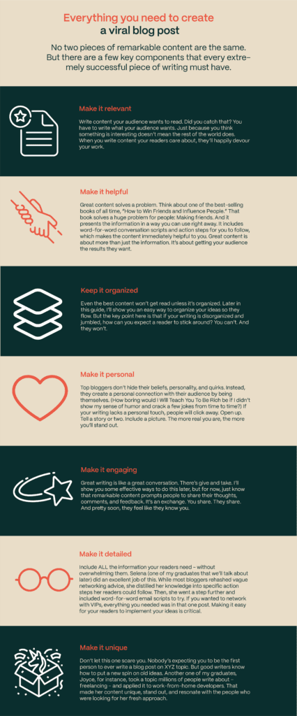 It’s true. With one piece of remarkable content, you can instantly turn yourself into a sought-after expert. The catch? You’ve got to create that amazing post first. Let me show you how that’s done. To do that, I’m going to break down exactly what you need to write a viral blog post.