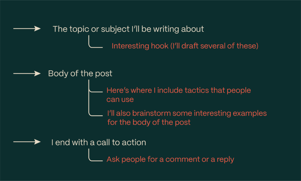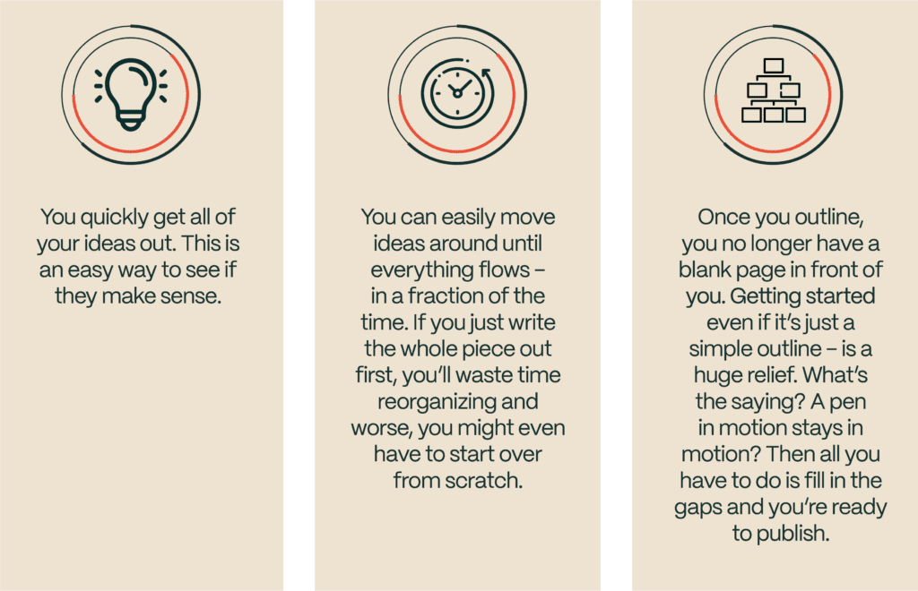 Notice how simple this is. It makes it easier to get started. Your outline can be as brief or detailed as you want. You’re not doing it for other people. You’re just giving yourself a framework to start writing. And once you have the skeleton, you can turn it into great content in a fraction of the time.