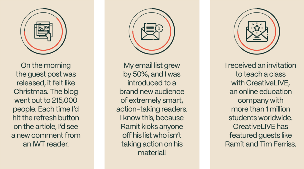 “When I was invited to write a guest post for IWT, I knew it was going to be one of the biggest exposure opportunities for my business. After all, Ramit has 215,000 highly engaged and responsive newsletter readers.”