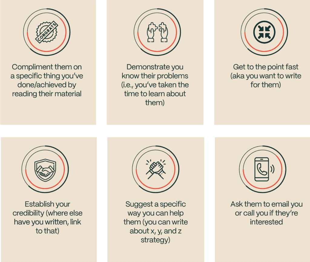 Use my favorite strategy for getting any VIP’s attention. This technique makes it almost impossible for them to turn you down. Here’s an overview of what your email pitch should include:
