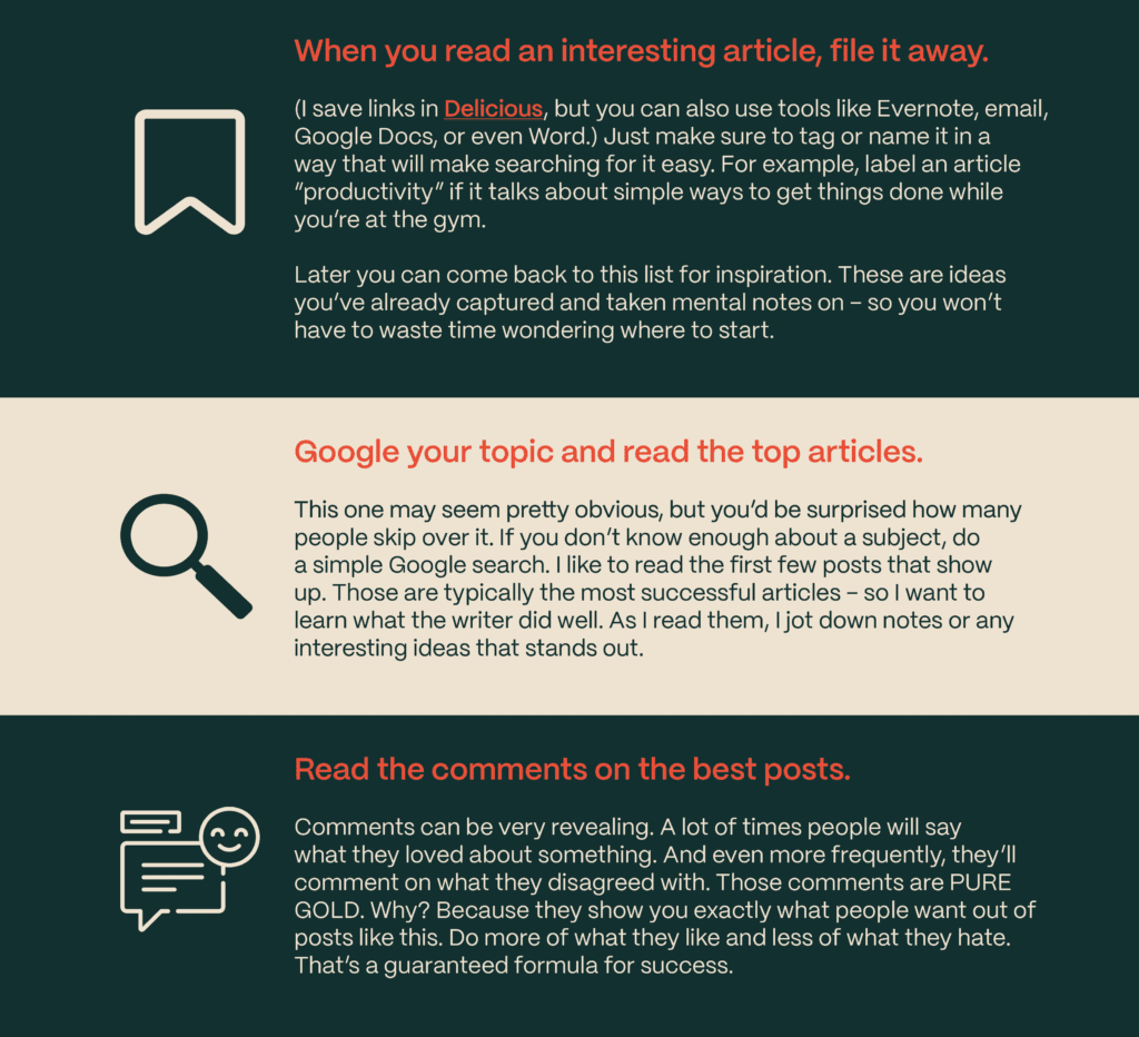 I always base my content on something that’s already proven to work. I used to fire up WordPress and stare at the blank white screen. And I’d get NOWHERE. Today, I base my content on a topic, framework or structure that’s already performed well. (I call this The Skyscraper Technique.)